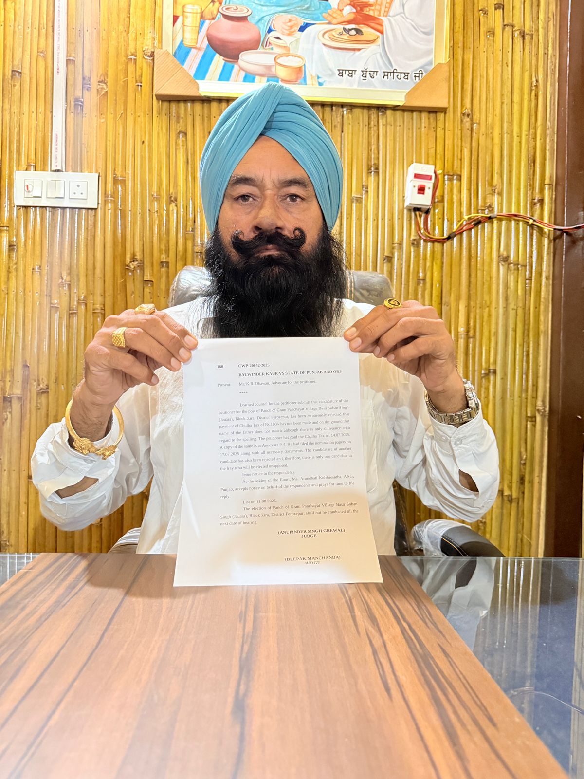 ਜ਼ੀਰਾ, 26 ਜੁਲਾਈ ( ਗੁਰਪ੍ਰੀਤ ਸਿੰਘ ਸਿੱਧੂ ) :- ਪੰਜਾਬ ਅਤੇ ਹਰਿਆਣਾ ਹਾਈਕੋਰਟ ਨੇ ਪਿੰਡ ਬਸਤੀ ਸੋਹਣ ਸਿੰਘ (ਜੌੜਾ) ਦੀ ਗ੍ਰਾਮ ਪੰਚਾਇਤ ਦੀ ਪੰਚ ਚੋਣ ’ਤੇ ਅਗਲੀ ਸੁਣਵਾਈ, 11 ਅਗਸਤ 2025, ਤੱਕ ਰੋਕ ਲਗਾਉਣ ਦੇ ਹੁਕਮ ਜਾਰੀ ਕੀਤੇ ਹਨ। ਇਹ ਫੈਸਲਾ ਪਟੀਸ਼ਨਰ ਬਲਵਿੰਦਰ ਕੌਰ ਦੀ ਅਰਜ਼ੀ ’ਤੇ ਸੁਣਵਾਈ ਦੌਰਾਨ ਜਸਟਿਸ ਅਨੁਪਿੰਦਰ ਸਿੰਘ ਗਰੇਵਾਲ ਦੀ ਬੈਂਚ ਨੇ ਸੁਣਾਇਆ।