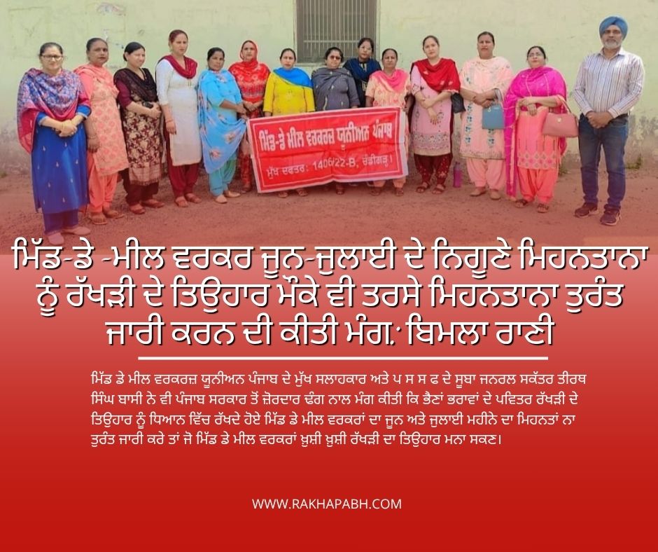 ਮਿੱਡ -ਡੇ-ਮੀਲ ਵਰਕਰਜ਼ ਯੂਨੀਅਨ ਪੰਜਾਬ ਦੀ ਸੂਬਾ ਪ੍ਰਧਾਨ ਬਿਮਲਾ ਰਾਣੀ ਫਾਜ਼ਿਲਕਾ, ਜਨਰਲ ਸਕੱਤਰ ਕਮਲਜੀਤ ਕੌਰ ਹੁਸ਼ਿਆਰਪੁਰ,ਵਿੱਤ ਸਕੱਤਰ ਪ੍ਰਵੀਨ ਕੌਰ ਫ਼ਤਿਹਗੜ੍ਹ ਸਾਹਿਬ, ਸੀਨੀਅਰ ਮੀਤ ਪ੍ਰਧਾਨ ਮਮਤਾ ਸੈਦਪੁਰ ਕਪੂਰਥਲਾ ਕਿਹਾ ਕਿ ਪੰਜਾਬ ਸਰਕਾਰ ਦੇ ਮੁੱਖ ਮੰਤਰੀ ਸਾਹਿਬ ਅਤੇ ਵਿੱਤ ਮੰਤਰੀ ਸਾਹਿਬ ਪੰਜਾਬ ਸਰਕਾਰ ਵਲੋਂ ਵਾਰ ਵਾਰ ਕਿਹਾ ਜਾ ਰਿਹਾ ਹੈ ਕਿ ਪੰਜਾਬ ਸਰਕਾਰ ਦਾ ਖ਼ਜ਼ਾਨਾ ਭਰਿਆ ਹੋਇਆ ਹੈ ਅਤੇ ਜੀ ਐੱਸ ਟੀ ਦਾ ਟੈਕਸ ਵੀ ਪਿਛਲੇ ਸਾਲ ਨਾਲੋਂ ਵੱਧ ਇਕੱਠਾ ਹੋਇਆ ਹੈ ਪਰ ਸਰਕਾਰੀ ਸਕੂਲਾਂ ਵਿੱਚ ਬੱਚਿਆਂ ਨੂੰ ਦੁਪਿਹਰ ਦਾ ਖਾਣਾ ਤਿਆਰ ਕਰਕੇ ਖਵਾਉਣ ਵਾਲੀਆਂ ਮਿੱਡ ਡੇ ਮੀਲ ਵਰਕਰਾਂ ਨੂੰ ਅਜੇ ਤੱਕ ਵੀ ਦਿੱਤਾ ਜਾਂਦਾ 3000/- ਰੁਪਏ ਪ੍ਰਤੀ ਮਹੀਨਾ ਦਾ ਮਾਮੂਲੀ ਜਿਹਾ ਮਿਹਨਤਾਨਾ ਜੂਨ ਅਤੇ ਜੁਲਾਈ ਮਹੀਨੇ ਦਾ ਨਾਂ ਦੇਣ ਦੀ ਸਖ਼ਤ ਨਿਖੇਧੀ ਕਰਦੇ ਹੋਏ ਪੰਜਾਬ ਸਰਕਾਰ ਤੋਂ ਜ਼ੋਰਦਾਰ ਢੰਗ ਨਾਲ ਮੰਗ ਕੀਤੀ ਕਿ ਭੈਣਾਂ ਭਰਾਵਾਂ ਦੇ ਗੂੜ੍ਹੇ ਰਿਸ਼ਤੇ ਨੂੰ ਪ੍ਰਗਟ ਕਰਦੇ ਰੱਖੜੀ ਦੇ ਤਿਉਹਾਰ ਨੂੰ ਧਿਆਨ ਵਿੱਚ ਰੱਖਦੇ ਹੋਏ ਮਿੱਡ ਡੇ ਮੀਲ ਵਰਕਰਾਂ ਨੂੰ ਜੂਨ ਅਤੇ ਜੁਲਾਈ ਦੋ ਮਹੀਨਿਆਂ ਦਾ ਮਿਹਨਤਾਂ ਨਾ ਤੁਰੰਤ ਜਾਰੀ ਕੀਤਾ ਜਾਵੇ ਤਾਂ ਜੋ ਮਿੱਡ ਡੇ ਮੀਲ ਵਰਕਰਾਂ ਮਿਹਨਤਾਨਾ ਮਿਲਣ ਤੇ ਭੈਣਾਂ ਅਤੇ ਭਰਾਵਾਂ ਦੇ ਰਿਸ਼ਤੇ ਵਿਚਲੇ ਪਿਆਰ ਨੂੰ ਪ੍ਰਗਟ ਕਰਦਾ ਰੱਖੜੀ ਦਾ ਪਵਿੱਤਰ ਤਿਉਹਾਰ ਚਾਵਾਂ ਅਤੇ ਖੁਸ਼ੀਆਂ ਨਾਲ ਮਨਾ ਸਕਣ।ਮਿੱਡ ਡੇ ਮੀਲ ਵਰਕਰਜ਼ ਯੂਨੀਅਨ ਪੰਜਾਬ ਦੇ ਮੁੱਖ ਸਲਾਹਕਾਰ ਅਤੇ ਪ ਸ ਸ ਫ ਦੇ ਸੂਬਾ ਜਨਰਲ ਸਕੱਤਰ ਤੀਰਥ ਸਿੰਘ ਬਾਸੀ ਨੇ ਵੀ ਪੰਜਾਬ ਸਰਕਾਰ ਤੋਂ ਜ਼ੋਰਦਾਰ ਢੰਗ ਨਾਲ ਮੰਗ ਕੀਤੀ ਕਿ ਭੈਣਾਂ ਭਰਾਵਾਂ ਦੇ ਪਵਿਤਰ ਰੱਖੜੀ ਦੇ ਤਿਉਹਾਰ ਨੂੰ ਧਿਆਨ ਵਿੱਚ ਰੱਖਦੇ ਹੋਏ ਮਿੱਡ ਡੇ ਮੀਲ ਵਰਕਰਾਂ ਦਾ ਜੂਨ ਅਤੇ ਜੁਲਾਈ ਮਹੀਨੇ ਦਾ ਮਿਹਨਤਾਂ ਨਾ ਤੁਰੰਤ ਜਾਰੀ ਕਰੇ ਤਾਂ ਜੋ ਮਿੱਡ ਡੇ ਮੀਲ ਵਰਕਰਾਂ ਖ਼ੁਸ਼ੀ ਖ਼ੁਸ਼ੀ ਰੱਖੜੀ ਦਾ ਤਿਉਹਾਰ ਮਨਾ ਸਕਣ।