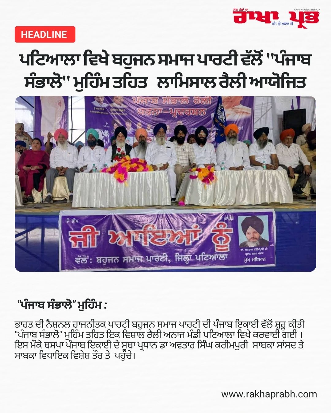 ਭਾਰਤ ਦੀ ਨੈਸ਼ਨਲ ਰਾਜਨੀਤਕ ਪਾਰਟੀ ਬਹੁਜਨ ਸਮਾਜ ਪਾਰਟੀ ਦੀ ਪੰਜਾਬ ਇਕਾਈ ਵੱਲੋਂ ਸ਼ੁਰੂ ਕੀਤੀ “ਪੰਜਾਬ ਸੰਭਾਲੋ” ਮੁਹਿੰਮ ਤਹਿਤ ਇਕ ਵਿਸ਼ਾਲ ਰੈਲੀ ਅਨਾਜ ਮੰਡੀ ਪਟਿਆਲਾ ਵਿਖੇ ਕਰਵਾਈ ਗਈ । ਇਸ ਮੌਕੇ ਬਸਪਾ ਪੰਜਾਬ ਇਕਾਈ ਦੇ ਸੂਬਾ ਪ੍ਰਧਾਨ ਡਾ ਅਵਤਾਰ ਸਿੰਘ ਕਰੀਮਪੁਰੀ ਸਾਬਕਾ ਸਾਂਸਦ ਤੇ ਸਾਬਕਾ ਵਿਧਾਇਕ ਵਿਸ਼ੇਸ਼ ਤੌਰ ਤੇ ਪਹੁੰਚੇ। ਇਸ ਮੌਕੇ ਠਾਠਾਂ ਮਾਰਦੇ ਵਰਕਰਾਂ ਦੇ ਇਕੱਠ ਨੂੰ ਸੰਬੋਧਨ ਕਰਦਿਆਂ ਸੂਬਾ ਪ੍ਰਧਾਨ ਕਰੀਮਪੁਰੀ , ਸੂਬਾ ਇੰਚਾਰਜ ਪ੍ਰਜਾਪਤੀ ਅਜ਼ੀਤ ਸਿੰਘ ਭੈਣੀ ਨੇ ਬਹੁਜਨ ਸਮਾਜ ਪਾਰਟੀ ਦੀ ਵਿਚਾਰਧਾਰਾ ਬਾਰੇ ਵਰਕਰਾਂ ਨੂੰ ਜਾਣਕਾਰੀ ਦਿੰਦਿਆਂ ਦੱਸਿਆ ਕਿ ਬਹੁਜਨ ਸਮਾਜ ਪਾਰਟੀ ਡਾਕਟਰ ਭੀਮ ਰਾਓ ਅੰਬੇਦਕਰ ਜੀ ਦੇ ਸੰਵਿਧਾਨ ਦੀ ਰਾਖੀ ਅਤੇ ਦਲਿਤ ਲੋਕਾਂ ਦੇ ਅਧਿਕਾਰਾਂ ਦੀ ਰਾਖੀ ਲਈ ਕੰਮ ਕਰਦੀ ਹੈ। ਉਪਰੰਤ ਸੂਬਾ ਉਪ ਪ੍ਰਧਾਨ ਬਲਦੇਵ ਸਿੰਘ ਮਹਿਰਾ ਨੇ ਪਿਛੜੇ ਸਮਾਜ਼ ਨੂੰ ਬਹੁਜਨ ਸਮਾਜ ਪਾਰਟੀ ਨਾਲ ਜੁੜਨ ਅਤੇ ਉਨ੍ਹਾਂ ਦੇ ਹਿੱਤ ਬਹੁਜਨ ਸਮਾਜ ਪਾਰਟੀ ਵਿੱਚ ਹੀ ਸੁਰੱਖਿਅਤ ਹਨ ਬਾਰੇ ਚਰਚਾ ਕਰਦਿਆਂ ਕਿਹਾ ਕਿ ਬਹੁਜਨ ਸਮਾਜ ਪਾਰਟੀ ਦੀ ਕੌਮੀ ਪ੍ਰਧਾਨ ਭੈਣ ਕੁਮਾਰੀ ਮਾਇਆਵਤੀ ਜੀ ਨੇ ਸਾਰਿਆਂ ਸੂਬੀਆ ਤੋਂ ਪਹਿਲਾਂ ਮੰਡਲ ਕਮਿਸ਼ਨ ਦੀ ਰਿਪੋਰਟ ਲਾਗੂ ਕੀਤੀ। ਬਹੁਜਨ ਸਮਾਜ ਪਾਰਟੀ ਦੇ ਸੂਬਾ ਜਨਰਲ ਸਕੱਤਰ ਤੇ ਜੋਨ ਇੰਚਾਰਜ ਪਟਿਆਲਾ ਲੈਕ ਅਮਰਜੀਤ ਸਿੰਘ , ਸੂਬਾ ਜਨਰਲ ਸਕੱਤਰ , ਇੰਚਾਰਜ ਪਟਿਆਲਾ ਰਾਜਾ ਰਜਿੰਦਰ ਸਿੰਘ, ਸੂਬਾ ਜਨਰਲ ਸਕੱਤਰ ਜੋਗਾ ਸਿੰਘ , ਸੂਬਾ ਜਨਰਲ ਸਕੱਤਰ ਡਾ ਮੱਖਣ ਸਿੰਘ ਸੰਗਰੂਰ, ਸੂਬਾ ਜਨਰਲ ਸਕੱਤਰ ਜਗਜੀਤ ਸਿੰਘ, ਪਵਿੱਤਰ ਸਿੰਘ ਸੰਗਰੂਰ ਨੇ ਆਖਿਆ ਕਿ 78 ਸਾਲਾਂ ਦੀ ਅਜ਼ਾਦੀ ਵਿੱਚ ਅਨੁਸੂਚਿਤ ਜਾਤੀ, ਪਛੜੀਆਂ ਸ਼੍ਰੇਣੀਆਂ ਨਾਲ ਹੁੰਦੀਆਂ ਜ਼ਿਆਦਤੀਆਂ ਸਮਾਜ ਦੇ ਸਾਹਮਣੇ ਹਨ ਅਤੇ ਹੁਣ ਤੱਕ ਦੀਆਂ ਸਰਕਾਰਾਂ ਨੇ ਉਨ੍ਹਾਂ ਨੂੰ ਇਨਸਾਫ ਨਹੀਂ ਦਿੱਤਾ। ਇਸ ਮੌਕੇ ਰੈਲੀ ਵਿਚ ਜ਼ਿਲ੍ਹਾ ਪ੍ਰਧਾਨ ਮੇਜਰ ਸਿੰਘ ਟਿੱਬੀ , ਖਜਾਨਚੀ ਗੁਰਮੀਤ ਸਿੰਘ, ਜ਼ਿਲ੍ਹਾ ਇੰਚਾਰਜ ਅਗ੍ਰੇਜ ਸਿੰਘ,ਸੁਖ ਲਾਲ, ਸੁਰਜੀਤ ਸਿੰਘ ਗੋਰੀਆਂ, ਰੂਪ ਸਿੰਘ ਬਠੋਈ, ਜਰਨੈਲ ਸਿੰਘ ਬਿੱਟੂ, ਰਾਜਿੰਦਰ ਸਿੰਘ ਚਪੜ, ਐਡਵੋਕੇਟ ਜਸਪਾਲ ਸਿੰਘ ਕਾਮੀ,ਅਮਰ ਸਿੰਘ ਸੈਪਲਾ, ਜਗਤਾਰ ਸਿੰਘ ਰੋੜਾਂਵਾਲੀ ਤੋਂ ਇਲਾਵਾਂ ਜ਼ਿਲ੍ਹਾ ਪਟਿਆਲਾ ਦੇ ਸਮੂਹ ਹਲਕਿਆਂ ਦੇ ਅਹੁਦੇਦਾਰਾਂ ਵਰਕਰਾਂ ਅਤੇ ਬਾਮਸੇਪ ਵਰਕਰਾਂ ਨੇ ਵੱਡੀ ਗਿਣਤੀ ਵਿਚ ਸ਼ਮੂਲੀਅਤ ਕੀਤੀ। ਉਪਰੰਤ ਡਿਪਟੀ ਕਮਿਸ਼ਨਰ ਪਟਿਆਲਾ ਨੂੰ ਅਨੁਸੂਚਿਤ ਜਾਤੀਆਂ ਅਤੇ ਪੱਛੜੀਆਂ ਸ਼੍ਰੇਣੀਆਂ ਨਾਲ ਹੋਈਆਂ ਵਧੀਕੀਆਂ ਲਈ ਜ਼ਿੰਮੇਵਾਰ ਵਿਅਕਤੀਆਂ ਨੂੰ ਸਜਾਵਾਂ ਦਿਵਾਉਣ ਲਈ ਮਾਰਚ ਦੇ ਰੂਪ ਵਿੱਚ ਮੰਗ ਪੱਤਰ ਦਿੱਤਾ ਗਿਆ।ਜਾਰੀ ਕਰਤਾ ਲੈਕਚਰ ਅਮਰ ਸਿੰਘ ਸੈਂਪਲਾ ਅਤੇ ਜਗਤਾਰ ਸਿੰਘ ਰੋੜੇਵਾਲ 9463491723
